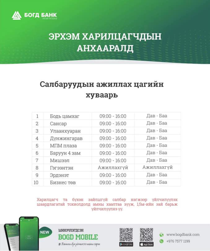 БОГД Банк нь Улсын онцгой комисс болон Мэргэжлийн хяналтын газрын заавар зөвлөмжийн хүрээнд салбар нэгж болон Төв оффистоо ариутгал халдваргүйжүүлэлт хийлгэсэн бөгөөд нийт банкны ажиллагсадаа олон улсад хүлээн зөвшөөрөгдсөн PCR шинжилгээнд хамруулж, улмаар харилцагч та бүхэндээ үйлчилгээ үзүүлэхэд бэлэн болсныг дуулгахад таатай байна. Өнөөдрөөс эхлэн Богд банкны салбарууд ажлын өдрүүдэд 09:00-16:00 цагийн хооронд нийтэд үйлчилгээ үзүүлж байгаа болно. Хөл хорио тогтоосон энэ онцгой цаг үед банкны зайлшгүй ажлын байран дээр ажиллах шаардлагатай албан тушаалтнаас бусад ажиллагсад маань иргэний үүргээ биелүүэн зайнаас онлайн горимд ажиллаж байна. Энэ хугацаанд банкны үйл ажиллагаа хэвийн явагдаж байгаа бөгөөд харилцагч та бүхэн маань цахим сувгаар банкны үйлчилгээг гэрээсээ гаралгүй тав тухтай авах боломжтой. Хэрэв та зайлшгүй салбараар үйлчлүүлэх тохиолдолд өөрийгөө болон бусдыг эрсдлээс хамгаалах үүднээс амны хаалт зүүж, бээлий өмсөн, хүн хоорондын зай барьж үйлчлүүлээрэй.